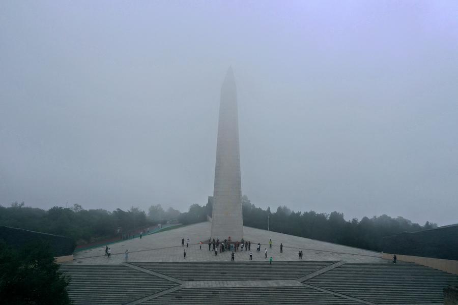A drone photo taken on July 8, 2025 shows a monument to the Hundred-Regiment Campaign in Yangquan, north China's Shanxi Province. The Hundred-Regiment Campaign took place in northern China from August 1940 to January 1941 during the Chinese People's War of Resistance Against Japanese Aggression. (Xinhua/Zhan Yan)