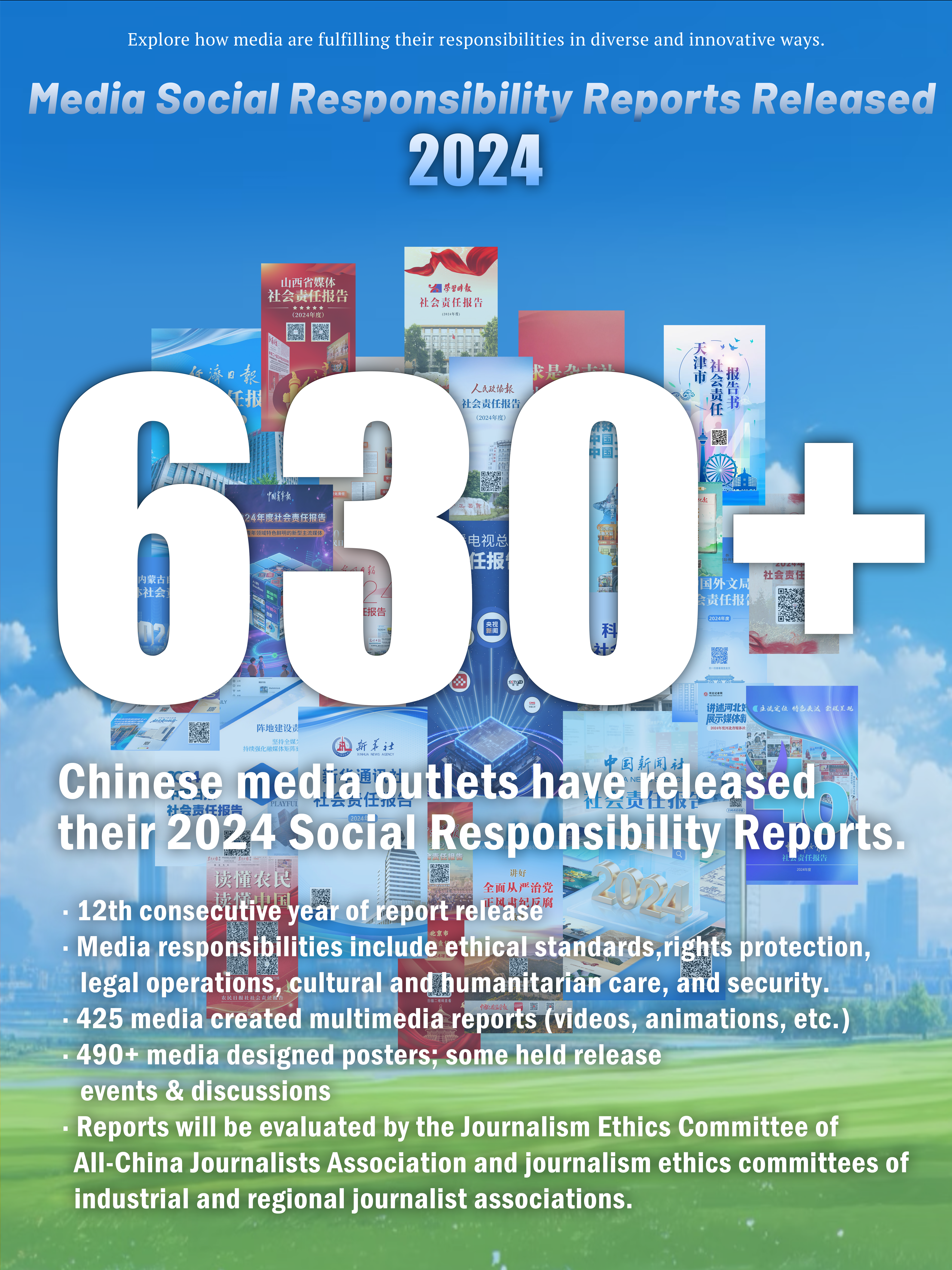 For the 12th consecutive year, media outlets across China have released their Social Responsibility Reports. This year, over 630 media outlets participated, ranging from national-level to county-level media centers. The reports highlight key responsibilities, including ethics, rights protection, and legal operations. In addition to traditional reports, 425 media outlets created multimedia versions like videos and animations, and over 490 designed impactful posters. Some also held release events and discussions.