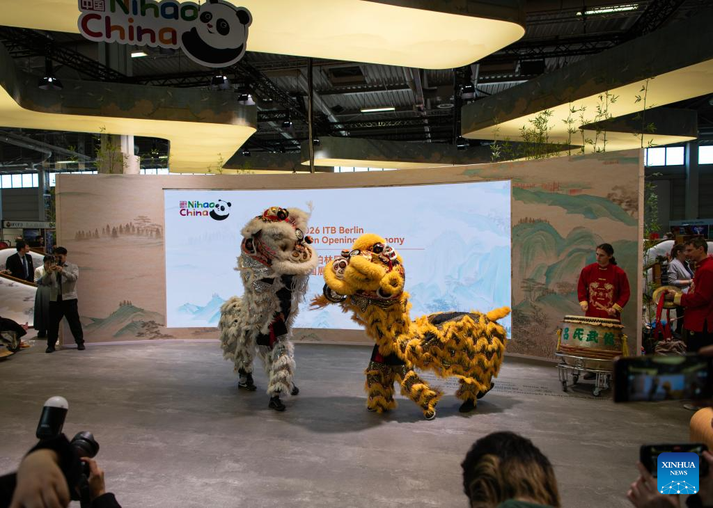 A lion dance is staged at the China pavilion during ITB Berlin 2026 in Berlin, Germany, on March 3, 2026. (Xinhua/Zhang Haofu)